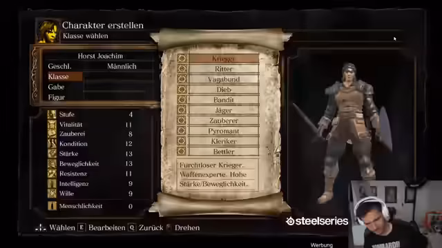 00:15:22Nach der Charaktererstellung, bei der der Streamer zwischen Krieger und Ritter abwägt, beginnt das eigentliche Gameplay. Der Streamer ist sichtlich ehrgeizig, jedoch verliert er schnell den Respekt vor den Gegnern, was zu mehreren und vermeidbaren Toden führt. Er erkennt sein Problem der Arroganz, die zu unachtsamen Fehlern führt. Der Fokus verlagert sich auf das Verständnis der Spielmechanik wie Parieren, Blocken und Rollen, wobei er sich für den Gebrauch eines Schilds entscheidet, um das Spiel zugänglicher und sicherer zu gestalten.