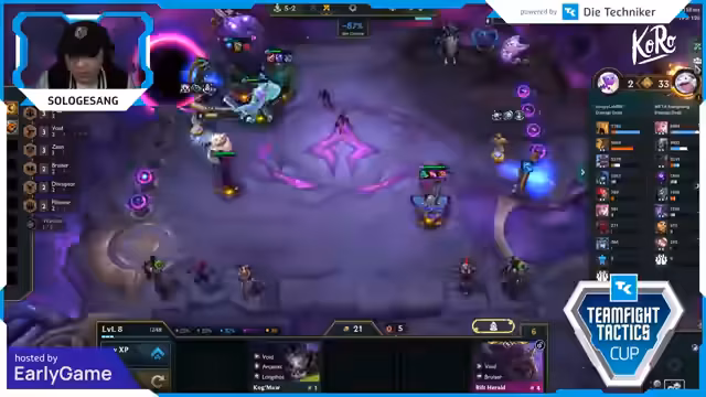 05:59:28Während des Spiels stellt der Streamer fest, dass das Erreichen von Level 10 aufgrund mangelnder Economy und teurer Augmente schwierig ist. Er muss seinen Plan anpassen und rollt, um die benötigten Einheiten wie Bruiser und Kaiser zu finden. Die Spannung steigt, da der Erfolg vom Finden der richtigen Items und Einheiten abhängt, um in den späteren Runden konkurrenzfähig zu bleiben und nicht aus dem Turnier auszuscheiden.