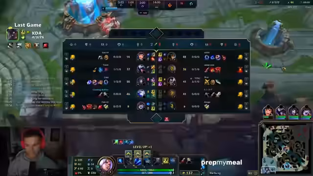 01:56:12Im analysierten Spielabschnitt steht die kritische Betrachtung der eigenen spielerischen Leistung im Fokus. Der Streamer äußert massive Frustration über den geringen Damage seines Champions, Mel, selbst mit zwei Items. Er stellt fest, dass sein Schaden sich extrem 'weird' anfühlt und er nicht verstehe, wann er keinen Damage mache und wann er einen Ziel 'one-shotte'. Die Entscheidung für das Item Cosmic Insight wird hinterfragt, da es im unterlegenen Team eher suboptimal sei und mehr Damage durch Horizon Focus sinnvoller gewesen wäre. Das Gameplay fühlt sich sehr statisch und unflexibel gegen mobile Gegner an.