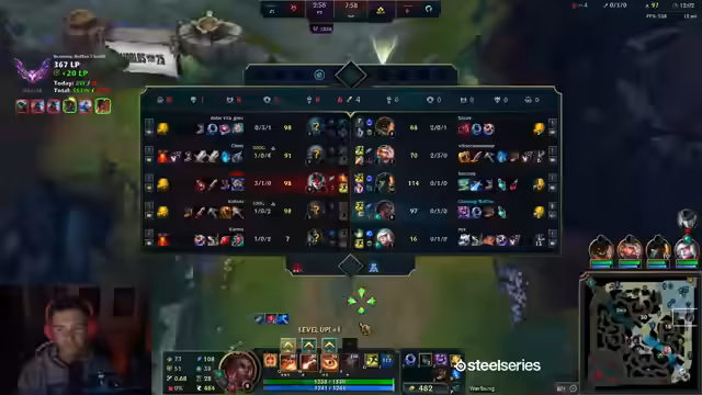 01:55:08Das Spiel wird als zunehmend schlecht bewertet, da drei Lanes verloren gehen. Der Gangplank-Build wird als 'exotisch' beschrieben, und der eigene Schaden als Mage wird als gering empfunden, besonders wenn Spells nicht präzise treffen. Es wird festgestellt, dass zwei Level-Ups nicht geskillt wurden, was als bedauerlich empfunden wird. Der Botlane-Verlauf wird als anfangs gut, aber nach einem Dive als schwierig beschrieben. Der Gegner hat einen deutlichen Vorteil durch zwei Drakes, Grubbs und einen 50 CS Lead auf der Toplane. Die späte Nutzung der Ultimate durch eine Teamkollegin wird kritisiert, da dies zu unnötigen Toden führt. Der Mel-E-Spell wird als langsam und schwer zu treffen beschrieben, ähnlich wie Lux-EQ, wobei Lux-EQ als schmaler und unauffälliger, Mel-E als 'fett und rot' beschrieben wird. Es wird überlegt, ob Cosmic Insight oder Max-Damage-Items besser wären, wobei Cosmic Insight gewählt wird, um den Vergleich zu haben. Der geringe Wave Clear mit einem Item wird als 'tough' empfunden, und der Melfight als nicht rechtzeitig anwesend.