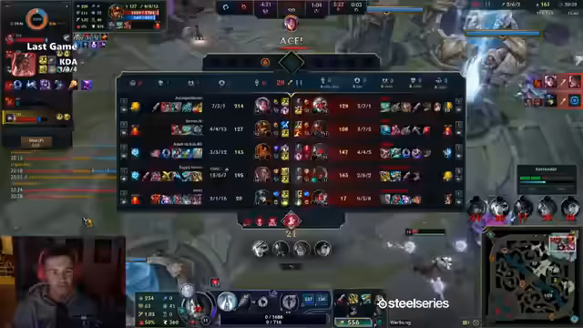 03:23:16Im späten Spielverlauf konfrontiert der Streamer ein scheinbar unlösbares Problem: der Gegner spielt Aurelion Sol, der einen extrem hohen Schaden verursacht. Der Streamer ist am Ende des Spiels Full Build, fühlt sich aber völlig machtlos und weiß nicht, wie er das Game beeinflussen oder überhaupt 'impacten' soll. Er kann nicht zur Aurelion Sol durchdringen, ohne sofort getötet zu werden. Sein eigener Champion wird von den gegnerischen Champions und vor allem dem Ulti von Aurelion Sol dominiert. Das Spiel wirkt völlig absurd und erfindet sich selbst nach 15 Jahren Erfahrung nicht, wie man dieses Matchup gewinnen kann. Es fehlt ihm ein entscheidendes Puzzleteil des Spielverständnisses.