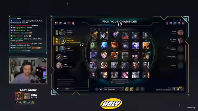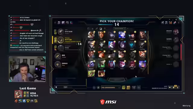00:06:38Der Streamer diskutiert über Champion-Wahlen und -Strategien. Er entscheidet sich für Ezreal Jungle und erwägt andere Champions wie Samira und Karma. Er äußert sich über die aktuellen Meta-Trends und erwähnt, dass viele Spieler unkonventionelle Picks machen. Der Streamer zeigt sich offen gegenüber verschiedenen Champion-Kombinationen, auch wenn sie auf den ersten Blick nicht sinnvoll erscheinen.
