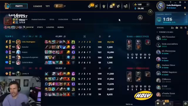 04:45:14Das Spiel endet mit einem Sieg, aber der Streamer ist unzufrieden mit seinem letzten Teamfight und analysiert die Fehler in der Kommunikation und Koordination. Er diskutiert die Stärken der gegnerischen Draven und kritisiert die fehlende Support-Interaktion. Der Streamer zögert ein letztes Mal mit dem Engagement, bevor das Spiel offiziell endet und er sich auf den bevorstehenden LEC-Stream vorbereitet.