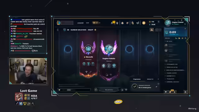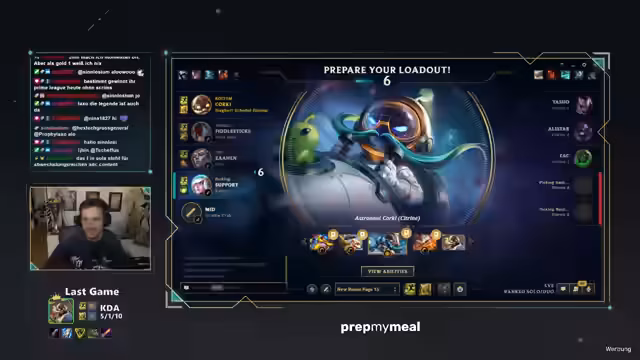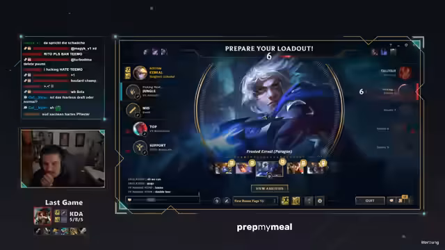 00:01:02Zu Beginn des Streams teilt der Streamer seine positiven Erfahrungen im Fitnessstudio und der Sauna mit, die ihn zu einem guten Spiel in der Solo-Küration verholfen haben. Er unterhält sich über einen Gewinn-Traum und spricht seine Vorhersage für das bevorstehende Prime-League-Spiel aus, in dem er befürchtet, dass Corki gebannt wird. Daraufhin beginnt die Diskussion über mögliche Alternativ-Champions für die Mid-Lane wie Ezreal oder Jhin, um den bevorstehenden Gegner zu konfrontieren.