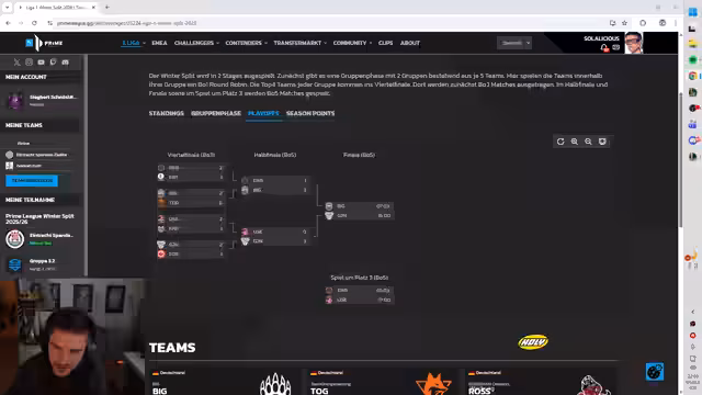 07:33:15Das Spiel wird trotz anfänglicher Schwierigkeiten letztendlich gewonnen, wobei der Schlüssel in einer besseren Makro-Spielweise und der Sicherung wichtiger Objective lag. Direkt nach dem Sieg wird der Fokus auf die anstehende Prime League verlagert. Es werden die Playoff-Termine bekannt gegeben, an denen der Streamer als Kommentator teilnehmen wird, und der Ausblick auf die kommenden Matches in der regulären Saison gegeben.