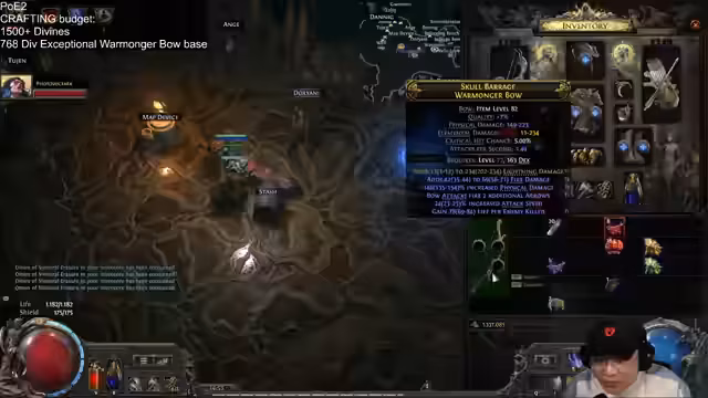 02:28:20Nachdem der Ring-Crafting-Betrag aufgebraucht ist, beginnt der Streamer mit einem neuen, anspruchsvollen Projekt: dem Craft eines Exceptional Warmonger Bogen. Er beschafft eine seltene Basis mit Item Level 82 für 738 Divine Orbs. Das Ziel ist es, einen Bogen mit hohen physischen Schaden, kritischem Treffer und Angriffsgeschwindigkeit zu erschaffen. Der Prozess wird als das bislang aufwendigste Crafting-Vorhaben im Stream bezeichnet.