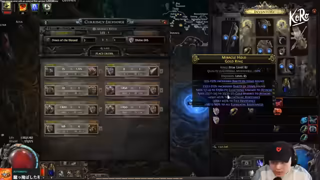 00:41:29Während des Streams wechselt der Fokus kurz zum Spiel Path of Exile, in dem der Streamer Zeit verbracht hat. Es wird ein detaillierter Prozess des Item-Craftings erläutert. Das Ziel ist es, einen Ring mit spezifischen, hochwertigen Modifikatoren wie 'Lightning Damage to Attacks' und 'Rarity' herzustellen. Der komplexe Prozess, der verschiedene Währungen wie Divine und Exalted Orbs sowie spezielle Werkzeuge wie Omens und Essences verwendet, wird Schritt für Schritt erklärt, bis ein Ring mit passablen Stats entsteht.