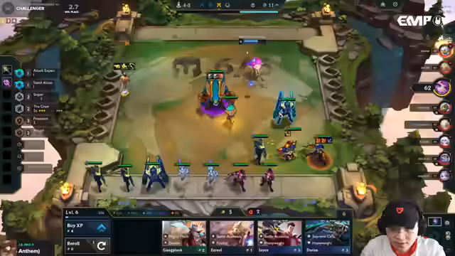 01:32:37Während des Spiels führt der Streamer intensives Scouting durch, um die Kombinationen der Gegner zu identifizieren. Er wechselt aktiv zwischen der Suche nach Einheiten wie Akali und Xante, indem er Monster-Targets umschaltet, um seine Bench zu optimieren. Als er feststellt, dass ein Gegner Ahri-Lunens spielt, entscheidet er sich für ein Power-Up für sein Xante. Er wählt 'Surge', da es beiden benötigten Stats (AP und Attack Speed) für sein Item 'Static Shiv' liefert, statt des üblichen 'Fairytale', das man bei Mana-Items nutzt.