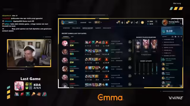 02:37:36Nach dem verlorenen Spiel wurde die Entscheidung, von einer 'gefütterten' Senna wegzugehen, kritisiert. Die/er reflektierte eigene taktische Fehler, wie ein unnötiges Top-Lane-Roam anstatt dem Spielen in der Mitte, was zum Tod führte. In der Lobby des nächsten Spiels wurden die gegnerischen Picks Yasuo, K'Sante und Zeri als selten wahrgenommen und analysiert. Eine Strategie für das bevorstehende Game wurde vorgeschlagen, bei der die/er Full Scaling mit Conqueror-Laufbahnen auf Aphelios wählte, um das späte Spiel zu dominieren.