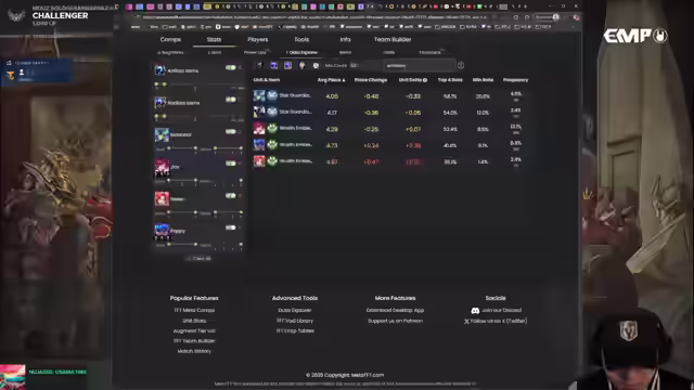 00:37:36Die Comps, die der Streamer spielt, sind Jinx Flex (nicht Full Star Games, sondern Past Star Games) mit Volibear, Varus, Braum, Karma (die normale Sex-Sorcerer-Variante), Samira Soulfighter und Rise. Es wurde eine neue Compte entdeckt: die Star Guardian Rave Combo, bei der Malsa als AP Carry gespielt wird, Poppy als Main Tank mit Star Guardians und Heavyweight und Jinx als Secondary Carry. Late Game gibt es Optionen auf Varus und Seraphine. Windstreak Level 8 Pushen ist schwieriger als die Reroy-Combos, aber wenn man perfekt spielt und seine Wind Conditions (Soulfighter Gewinn 2) hinbekommt, kann man auch gewinnen. Der Streamer highlightet die Kombos, die er spielt, in einer Tabelle. Er baut AP-Items für Malsaha, Rise oder Karma, und AD-Items für Malsaha Jinx, Samira oder Senna Volibear in der Rise-Combo. Es wird über Saya, Jin Melfeldt, Soulfighter Samira, Malsa Heavyweights, Kale, Economy Region und Rice diskutiert. Kennen Hero ist in Ordnung. Für die Samira sind Guter gut Reis gut, aber weit mal sehr gut. Es wird auch überlegt, ob Kaiser überhaupt noch spielbar ist, wenn Darius Ramos Contested sind. Der Streamer spielt nur der 8 kommt und fährt damit sehr gute Master plus. Er hat jetzt die Starga den Combo gespammt. Man kann Poppy oder Xanta stacken, ähnlich wie bei der Yumi-Kombo. Der Streamer schaut sich eine Wiederholung von Katarina Veteran an, um zu sehen, wie er auf Katarina kommt. Er würde gerne Windstreak Flex spielen und das rerollen den anderen lassen. Veteran ist am besten Stage 5 anscheinend, mit jeder Stage habe ich eine höhere Chance.