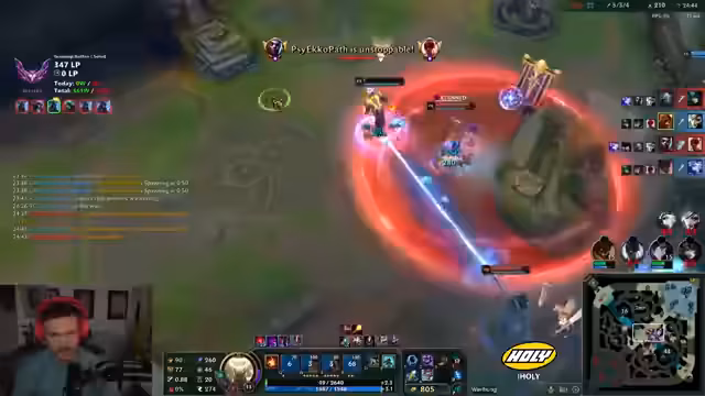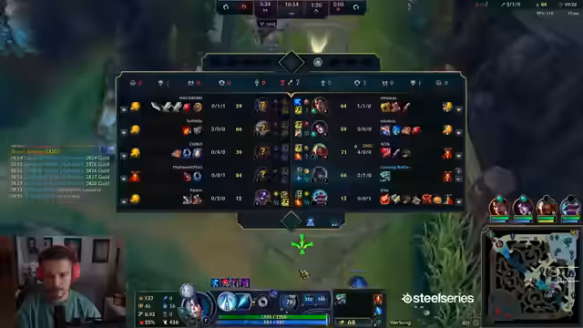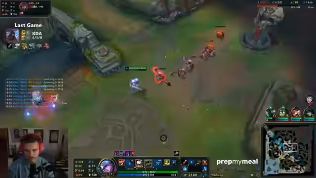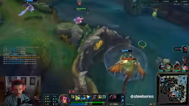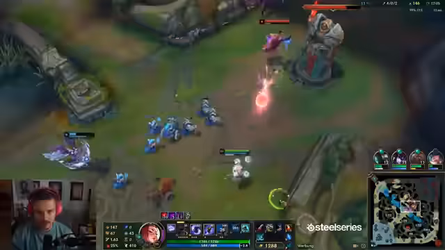 05:29:47Die Botlane wird als etwas schwieriger eingeschätzt, aber es wird versucht, aggressiv zu spielen und Trades zu suchen, ohne zu lange in Reichweite der gegnerischen Rockets zu bleiben. Es wird auf die Position des gegnerischen Junglers Maokai geachtet. Ein erfolgreicher Gank auf die Botlane führt zu einem Flash von Ari. Der Drake wird gesichert, obwohl ein Spieler stirbt. Die Teams swappen die Lanes, und es wird überlegt, zurückzuswappen. Es wird versucht, Jinx zu eliminieren, und ein Mid-Tower wird eingenommen. Es wird über das nächste Objective, den Drake, gesprochen und die Notwendigkeit, Gold für Items zu sammeln. Ari roamt auf die Toplane, und es wird versucht, sie zu baiten. Der Streamer kauft sich Majes, da es ein Majes-Game ist. Die Jinx-Ulti wird beachtet, und Maokai wird eliminiert, was den Drake sichert. Es wird überlegt, den gegnerischen Jungle zu invaden.