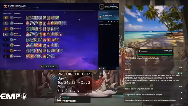 Es wurde ein Qualifikationsturnier für die Teamfight Tactics Weltmeisterschaft absolviert. Die besten 32 Spieler traten in sechs Spielen gegeneinander an, um Punkte in der Tabelle zu sammeln. Nach den Partien wurde eine detaillierte Analyse der Spielzüge und der begangenen Fehler vorgenommen. Die Ergebnisse des Tages behalten ihre Gültigkeit.
