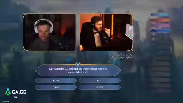 04:59:01Der Kandidat steht vor der Master-Frage, bei der es um den aktuellen CS-Rekord im E-Sport geht. Die Antwortmöglichkeiten sind 734, 512, 1465 und 1012. Der Kandidat schließt 512 und 734 schnell aus, da diese Zahlen zu niedrig erscheinen. Er schwankt zwischen 1012 und 1465, wobei sein Bauchgefühl zu 1465 tendiert, obwohl diese Zahl extrem hoch klingt. Der Streamer bestätigt, dass es um den Rekord in allen T1-Ligen geht. Der Kandidat überlegt, ob er einen Joker einsetzen soll, entscheidet sich aber dagegen. Er argumentiert, dass in einem langen Spiel von 60 Minuten 1000 CS möglich sind und in einem 90-Minuten-Spiel sogar noch mehr. Nach weiteren Überlegungen und dem Einbeziehen von Faktoren wie Super-Minion-Waves und ZZ-Rod-Portalen kommt er zu dem Schluss, dass 1465 realistisch sein könnten. Der Streamer gibt zu, dass einige seiner Gedankengänge gut waren, während andere ihn schockiert haben. Der Kandidat ruft seinen Telefonjoker Bröki an, um sich Rat zu holen. Bröki bestätigt seine Einschätzung, dass 512 und 734 zu niedrig sind und dass 1465 die wahrscheinlichste Antwort ist. Der Kandidat loggt schließlich C (1465) ein und liegt damit falsch. Der tatsächliche Rekord liegt bei 1012 CS, aufgestellt im LCK Spring Split 2018 von Teddy auf Sivir in einem 94-Minuten-Game. Der Kandidat erreicht somit nicht die Master-Promo.