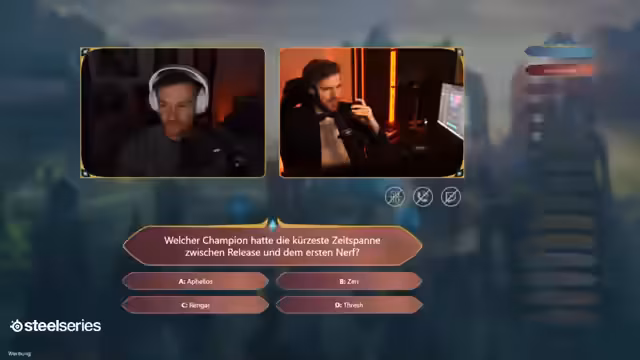 05:12:16Der Kandidat steht vor der Grandmaster-Frage, bei der es darum geht, welcher Champion die kürzeste Zeitspanne zwischen Release und dem ersten Nerf hatte. Die Optionen sind Aphelios, Zeri, Rengar und Thresh. Der Kandidat schließt Thresh aus, da Supporter seiner Meinung nach nicht so schnell generft werden. Er zieht Rengar in Betracht, da dieser frustrierend sein kann. Aphelios und Zeri hält er ebenfalls für möglich, ist sich aber unsicher, ob diese direkt nach Release zu stark waren. Er überlegt, seinen Joker zu nutzen, entscheidet sich aber dagegen und tendiert zu Rengar. Er argumentiert, dass Rengar aufgrund seines Frustrationspotenzials schnell generft worden sein könnte. Der Streamer gibt den Hinweis, dass es sich um einen konkreten Nerf handelt, nicht nur um einen Bugfix. Der Kandidat ruft erneut Bröki an, der ebenfalls zu Rengar tendiert. Der Kandidat loggt Rengar ein, was sich als falsch herausstellt. Der Streamer enthüllt, dass Mail vergessen wurde, der Champion mit der kürzesten Zeitspanne zwischen Release und Nerf. Mail wurde am 23. Januar veröffentlicht und am 25. Januar gehotfixed. Der Streamer gibt dem Kandidaten die Chance auf die Challenger-Frage, da er Mail vor der Auflösung erwähnt hatte.