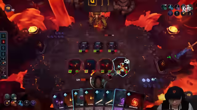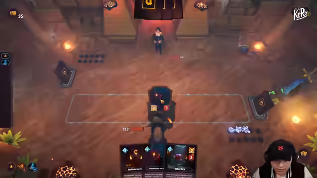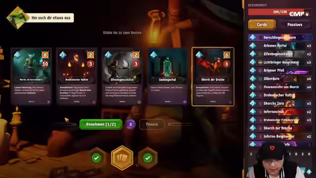 07:27:06Es wird ein Kartenspiel gespielt, das Elemente von Slay the Spire und Hearthstone kombiniert. Ziel ist es, das Leben des Gegners auf Null zu reduzieren, wobei man selbst über 200 Leben verfügt, der Gegner jedoch nur 10. Karten können nicht sofort gespielt werden und es gibt Spells. Es wird ein Feuerdeck gespielt, wobei das Rollen von Passiven wichtig ist, um Feuersachen zu erhalten. Das Spiel ist nicht gesponsert, sondern wird zum Spaß gespielt. Am Ende jeder Runde erfolgt ein zusätzlicher Angriff des Gegners. Der Todeslord kann Einheiten auffressen, um Angriff und HP zu erhalten. Flammenrufe von Scorch buffen den Drachen, der zufälligen Schaden verursacht. Kristalle verschwinden nach dem Kampf. Die passive Fähigkeit 'Ewige Flamme' gibt Verbündeten zu Beginn jeder Runde +1 Angriff. Violette Machtkarten kosten kein Mana, können aber nur einmal verwendet werden. Feuerkarten sind gut und haben Kombi-Effekte. Es wird überlegt, wann man bestimmte Karten wie den Drachen spielen sollte, um Mana-Krisen zu vermeiden. Der Lichtbringer Hauptmann ist stark und sollte früh eingesetzt werden, um HP zu sparen. Belohnungen wie Bogenschützen- und Untoten-Decks werden betrachtet, wobei Karten entfernt werden, die nicht zum Feuer-Deck passen. Es wird erklärt, wie man mit verschiedenen Karten und Einheiten interagiert, z.B. dem Todeslord und den Bogenschützen.
