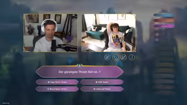 05:33:46Der Streamer testet das Wissen über League of Legends Skins, insbesondere zu verschiedenen Thresh-Skins. Die Frage lautet, welcher Thresh-Skin der günstigste ist. Die Optionen waren Deep Terror Thresh, Samsung White Thresh, Blood Moon Thresh und Unbound Thresh. Nach Recherche stellt sich heraus, dass Unbound Thresh mit 750 RP der günstigste Skin ist, während die anderen 975 RP kosten. Der Teilnehmer erkennt dies als korrekte Antwort.