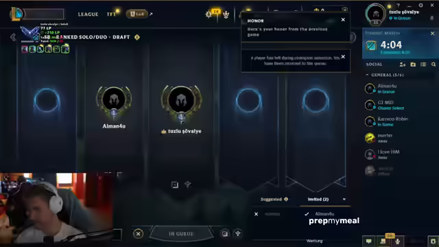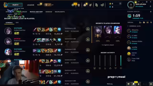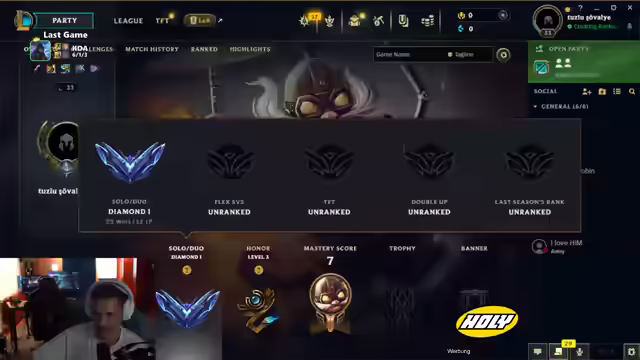 00:00:23Der Stream startet mit dem Ziel, die Türkei-Challenge fortzusetzen. Es wird der aktuelle Stand der Teilnehmer festgehalten: Norway hat Diamond 1 erreicht, während sich Karni, Brüggi und Streamer selbst in Emerald befinden. Der Streamer lobt eine Webseite, auf der man die Matches einsehen kann, wünscht sich aber eine detailliertere Anzeige der Divisionen. Er plant, Aphelios zu spielen und äußert sich positiv über das Essen vor Ort, obwohl es sich um einfache Pommes mit Wurst handelt. Er betont, dass Istanbul mehr Wassergrenze als Landgrenze hat und bereitet sich darauf vor, das Spiel ernst zu nehmen, um Freddy nicht mit einer Niederlagenserie zu begrüßen.