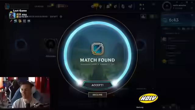 05:33:58Es wird überlegt, ob Draven First Pick gespielt werden soll. Der Streamer kann sich fast nicht einloggen mit dem Overlay. Es wird festgestellt, dass Nieder terrible für Draven ist, aber gut für Silas. Der Firefighter-Skin wird aus Respekt nicht geändert. Das Ziel ist, mehr als 6000 Damage zu schaffen. Es wird festgestellt, dass der Jungler ein Pro-Player ist und der Midlaner ein Smurf. Es wird wieder gegen zwei Smurfs gespielt, wobei der Milio 300 LP Master ist, aber off-roll. Der Silos ist auch ein Smurf. Es wird festgestellt, dass drei Smurfs im Team sind. Mel wird als frustrierender Champion bezeichnet. Es wird überlegt, wie man die Bombe reflektieren kann. Leona wird als härtester Counter gegen Mel genannt.