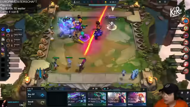 00:17:33Der Streamer beginnt, die ersten Sets der deutschen Spieler zu beobachten. Elia und Asad starten beide sehr stark. Elia erhält ein übermächtiges Economy-Augment und eine starke Startkomposition. Asad entscheidet sich für eine Cooking-Pot-Strategie mit einer stabilen Loose-Streak-Planung. Exo startet in einem anderen Set und sieht zunächst etwas schwächer aus. Entscheidend ist, dass beide Elia und Asad sich für eine Crystal-Gambit-Kombination entscheiden.