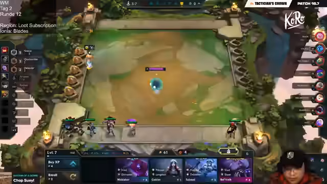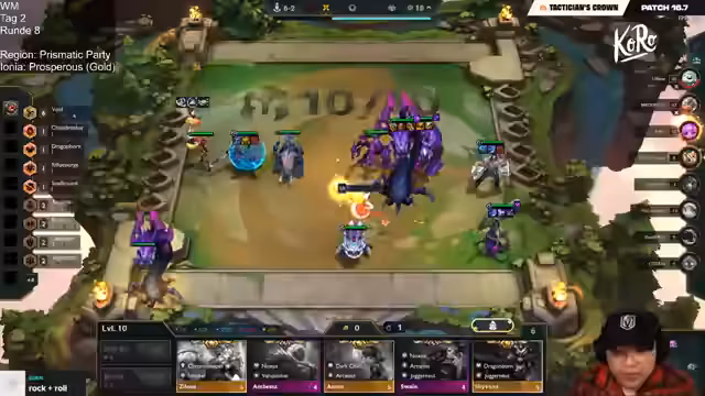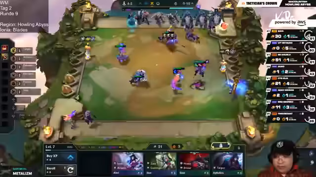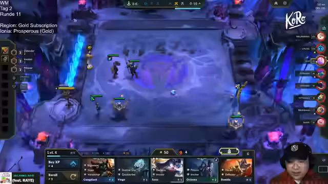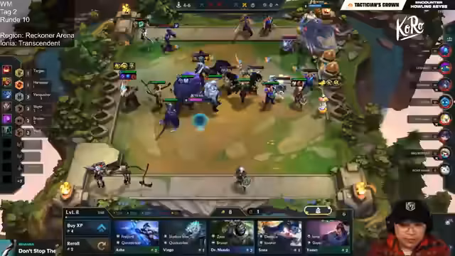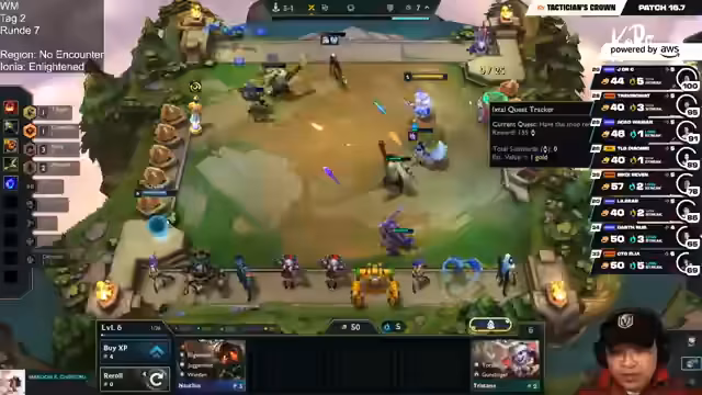 01:59:47Elia nimmt an der Tactician Crown teil, einem Turnier für das MetaTFT-Spiel. Dabei wurde er vom amerikanischen Team Citadel Gaming unter Vertrag genommen, nachdem er die Europameisterschaft gewonnen hat und sich für die Weltmeisterschaft qualifiziert hat. Das Turnier hat bereits Achteliminiert, nur noch 32 Spieler sind übrig. Die Punkte werden für das Finale zurückgesetzt,采用的是 Checkmate-System. Elia startete in Stage 1 mit dem Ziel, durch Goldverkäufe und gezielte Rolls eine starke Komposition aufzubauen.