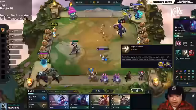 02:00:52Elia entscheidet sich für den Einsatz des 'Dummy-Fall'-Augments. Nachdem er zehn Gold gemacht und seine Einheiten verkauft hat, rollt er eine neue Komposition mit Zoe und Leona. Diese Entscheidung führt zu Loose-Streaks, die jedoch durch das Economy-Augment 'Calculate Loss' ausgeglichen werden. Dadurch kann er Gold und kostenlose Rolls ansammeln, um später auf Level 8 zu kommen und sein Board mit starken AP-Items zu pushen.