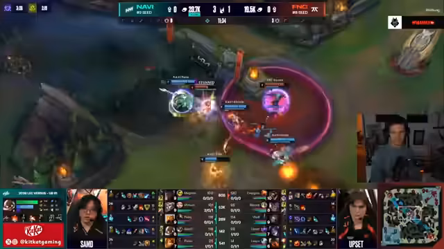 03:51:26Im zweiten Spiel versucht Fnatic, den Gameplan anzupassen, um der dominanten Navi-Midlane Pantheon-Thalia-Kombination zu begegnen. Trotz eines besseren Starts und einigen Erfolgen für Fnatic, kann Navi durch strategisches Objective-Management und überlegene Teamfights das Spiel für sich entscheiden. Das 0-2 gegen Navi bestätigt laut Kommentatoren die tiefgreifenden Probleme von Fnatic, insbesondere im Botlane.
