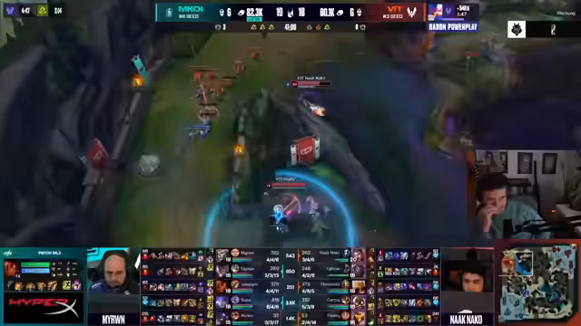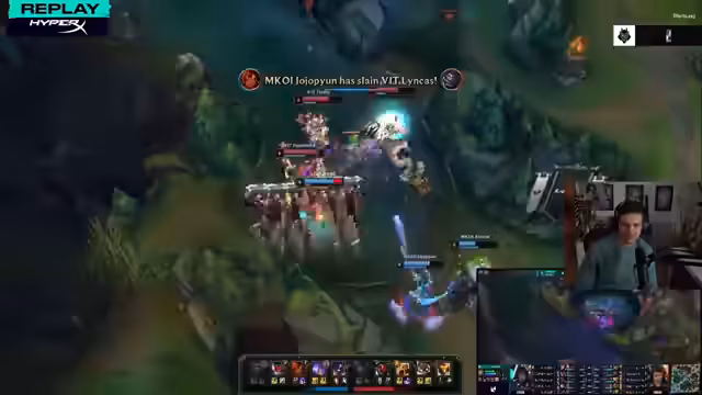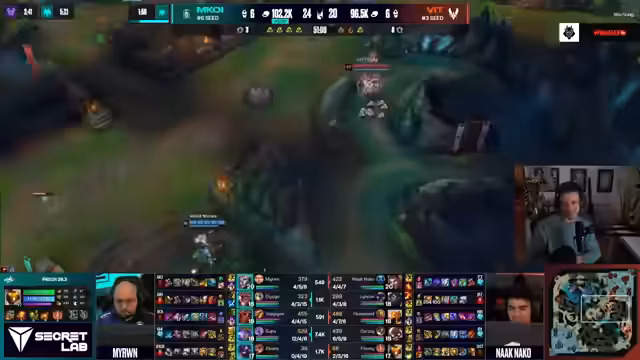 05:37:53Im weiteren Spielverlauf wird klar, dass die Team-Komposition von Vitality ohne Engage-Spells sehr schwach ist. Der Mundo wird als nutzlos beschrieben, während Kasi eine beeindruckende Leistung zeigt, die aber nicht ausreicht. Ein Teamkampf endet für MKoy erfolgreich. Mervyn und Humanoid werden getötet, nur Kasi überlebt. Der Sieg von M-Koy erscheint unausweichlich, was den Streamer frustriert.
