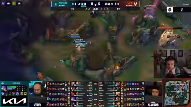 04:45:57Das zweite Spiel beginnt mit einem Draft, der Jace im Top-Lane für MKoy vorsieht. Das Spielstart ist für Vitality erfolgreich, doch Nagnarko hat wenig Impact im Kampf. Mervyn schlägt sich gut. Ein späterer Kampf führt zu einem 4-2 Trade für MKoy, wodurch die Kontrolle des Spiels an sie geht. Humanoid ist oft out of position, was seine Nützlichkeit einschränkt. M.Koy sichert sich den ersten Drachen, und die Lage für Vitality wird zunehmend schwierig.