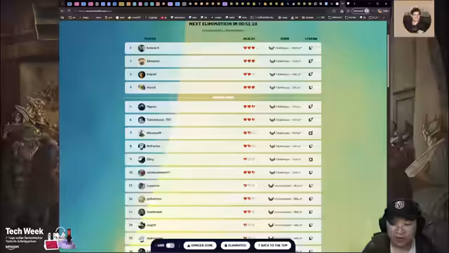 12:51:14Das 14-tägige Event befindet sich in den letzten drei Tagen, und die Danger Zone beginnt. Spieler, die in der Danger Zone (Plätze 23-5) sind und diese nicht verlassen, verlieren ein Leben. Nach drei verlorenen Leben werden sie aus dem Turnier eliminiert. Der aktuelle führende Spieler ist Benzak mit 1.000 LP, gefolgt von Bryson, Horro und Coinit. Es wird erwartet, dass der Wettbewerb hart sein wird, da nur noch eine Person am Ende übrig bleibt.