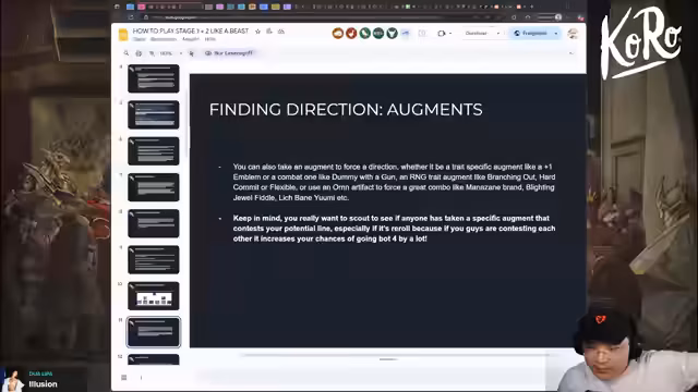 03:03:11Der Streamer betont, dass 'Finding Direction' ein fundamentales Konzept im lernen ist, um eine gute Anfangskombination zu erkennen. Ein grundlegendes Verständnis dafür ist entscheidend, um nicht suboptimale Kombinationen spielen zu müssen und wertvolle Öffner zu verschwenden. In späteren Phasen des Spiels sind Items, Augmente, Einheiten und Regionen die wichtigsten Faktoren. Dabei wird die strategische Interpretation von Komponenten als potenzielle, nicht als sofortige Items hervorgehoben, um die Flexibilität in der Item-Wirtschaft zu maximieren.