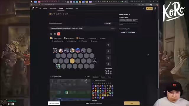 01:42:13Die Diskussion beginnt mit den Neuerungen des neuen Sets 15. Besonderes Augenmerk liegt auf den neuen Power-Ups, die es in großer Vielfalt zu lernen gilt. Der Streamer erkundet verschiedene Builds und Synergien, zum Beispiel mit Kog'Maw Juggernaut oder Malzahar mit Blighting Jewel. Es werden auch die Anmeldebedingungen für das Boxbox Bootcamp erläutert, die unter anderem Rang und durchschnittliche Zuschauerzahlen als Kriterien haben. Der Fokus liegt darauf, Wissen über diese neuen Mechaniken zu sammeln und zu strukturieren.
