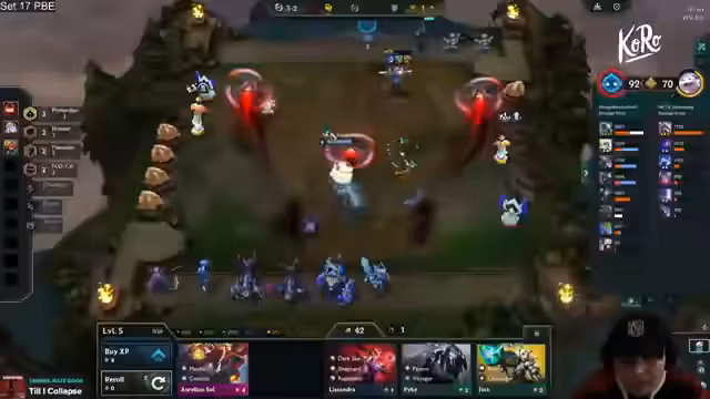 03:17:44Der Streamer äußert sich über das kürzlich gestartete neue SET 17 auf dem PBE. Er begrüßt die Reduzierung der Champions von 100 auf 63, was ihm mehr Spaß macht. Es wird eine Runde gespielt, in der er den Meta-Build mit Shen und Zoe für Attack-Speed und die Buffs für die Backline erläutert. Der spielerische Prozess des Rollens nach Units und Items wird gezeigt, und die Mechanik der Unit-Buffs wird erklärt.