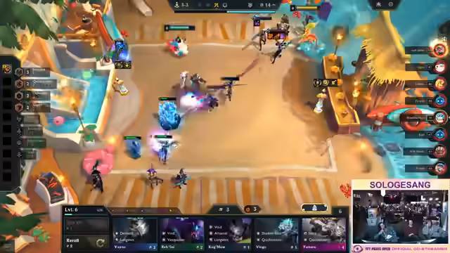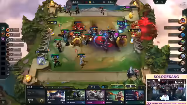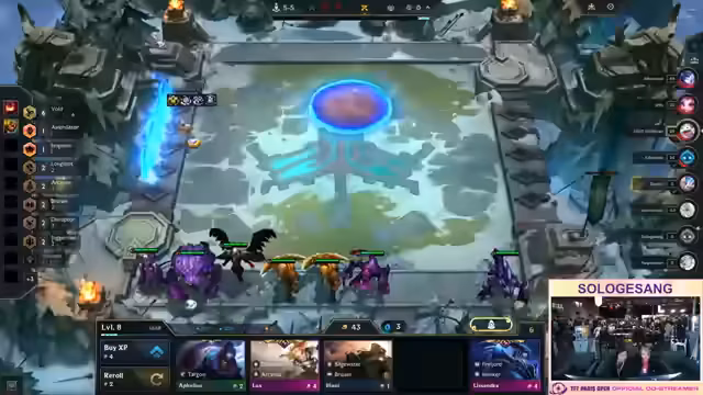 03:05:09Der Stream wechselt zur nächsten Phase, wo Solosongs ehemalige Teamkollegen (Löscher, WetJungler) in ihren Lobbys antreten. Löscher benötigt nach seinem 6. Platz im ersten Spiel eine Top-3-Platzierung für den Gruppenaufstieg. WetJungler führte sein Spiel an. Die Gruppe diskutiert ungewöhnliche Spielzüge, wie einen Spatula auf Kog'Maw zur frühen Kai'Sa-Freischaltung (Level 5), was als kreative Adaption im unbesetzten Void-Meta gewertet wird. Es folgt eine strategische Tiefeanalyse zu Void-Spatula-Nutzung und optimalen Level-8-Boards mit Ahri/Sett/Wukong-Kombinationen.