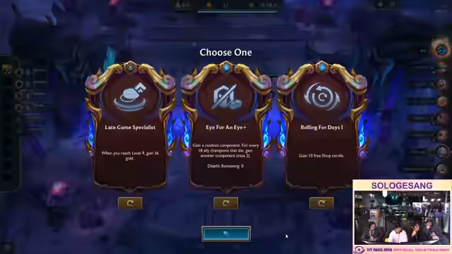 09:15:21Jungler optimiert sein Board nach einem verlorenen Streak, erhält Radiant Nashor und andere Items, die als Game-Changer bewertet werden. Triple Cannon Shops werden als extrem mächtig eingestuft, während Makeshift Armor mit vielen Emblemen als schwierig umsetzbar kritisiert wird. Die Diskussion dreht sich um Reforger-Strategien, um unpassende Traits wie Void und Noxus zu entfernen. Ein Goldaugment wird als mögliches Next-Step-Augment vorgeschlagen, besonders bei vielen vorhandenen Items und einer zusätzlichen Unit.