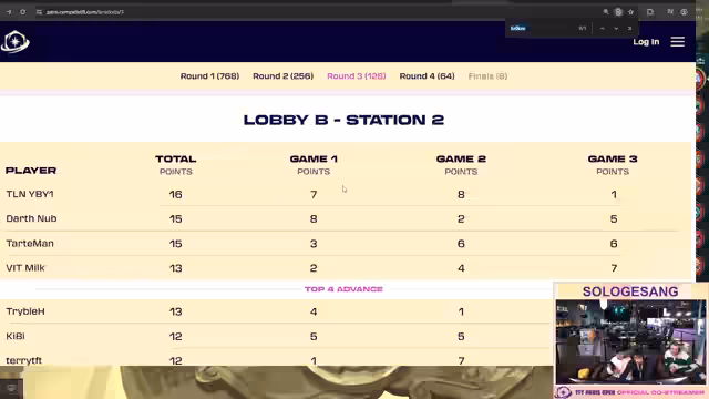03:16:40Lohsherr kämpft ums Überleben mit nur 15 HP nach verlorenen Fights. Das Turnierformat wird erklärt: Nach drei Spielen qualifizieren sich die Top 4 jeder Lobby für eine neue Runde. Spieler wie Ashmo und Dishsoap haben bereits gute Platzierungen, während Lohsherr einen First-Place benötigt, um noch eine Chance zu haben. Die Punkteverteilung wird diskutiert, wobei hohe Platzierungen in der nächsten Runde entscheidend für die Qualifikation sind. Besonders spannend ist die Situation für Sologasang, der noch Potential für ein Top-4-Placement sieht.