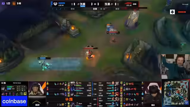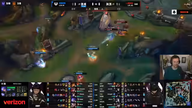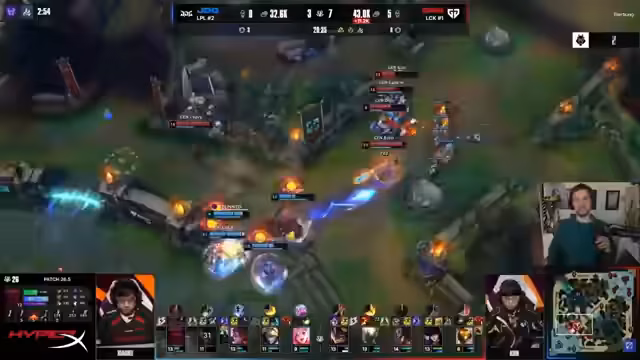 00:42:10Nach dem verlorenen Teamfight ist das Spiel praktisch entschieden. Gen.G. dominiert den Rest des Spiels, ziegt ohne Gegenwehr alle Objekte und Türme und gewinnt das Game in nur 23 Minuten. Kommentatoren bemerken, wie respektlos die Leistung von Gen.G. gegenüber einem der zweitbesten Teams Chinas wirkt. JDG kann weder ihre Team-Komp nutzen noch in den Kämpfen einen Fuß fassen. Analysten diskutieren auch die psychische Hürde von Gen.G. bei internationalen Turnieren, insbesondere der "Worlds-Choke" bei Chovy.