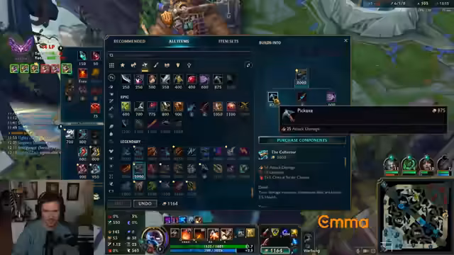 02:08:01Der Streamer analysiert die Problematik von Ezreal, der durch fehlenden DPS zu schnell irrelevant wird, besonders wenn Gegner HP-Items bauen. Er schlägt eine risikoreichere Strategie vor, die in die Auto-Tag-Range geht, mehr Schaden verspricht. Anschließend wird das Collector-Item in den Fokus gerückt. Seine Hauptargumentation für das Item in Solo-Q ist, dass es durch die Teil-items (Pickaxe, Dirk) jederzeit stark macht und es ermöglicht, Kills auch dann zu last-hitten, wenn man nur einen Assist bekommen hätte. Dadurch lässt sich das Snowballen des Spiels aktiv beeinflussen.