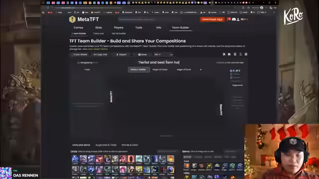 00:31:22Der Streamer analysiert diverse Meta-Kompositionen für Set 17. Ein Fokus liegt auf der AD-Mech-Kombination, die er als stark bewertet. Er erläutert Builds für Morgana als Haupt-Carry mit Items wie Elderwood und Badin, die Stärken von Kindred als später Carry und den Potenzial von Urgot in bestimmten Setups. Besonders wird die Combos mit Mecka-Einheiten und deren Transformation als 'broken' eingestuft. Er zeigt auch praktische Beispiele für Item-Builds auf dem Board und geht auf Champion-Synergien ein.