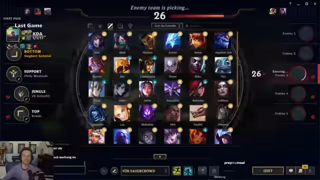 03:30:31Der Streamer schlägt einen Aram vor, um die restliche Zeit zu überbrücken, und lädt Kevin und Karl Marx zum Spielen ein. Er ruft die Zuschauer auf, ihre Namen einzutragen, wenn sie mitspielen möchten. Der Streamer wählt Ezreal als Champion und kommentiert Mailmana aus dem Jahr 2009. Es werden verschiedene Male Champions wie Blizzcrak, Tarik und Elis diskutiert. Der Streamer ist sich sicher, dass ein Goatspiel bevorsteht und der Draft Team Aatrox, Xin, Annie, Corki und Nami genannt.