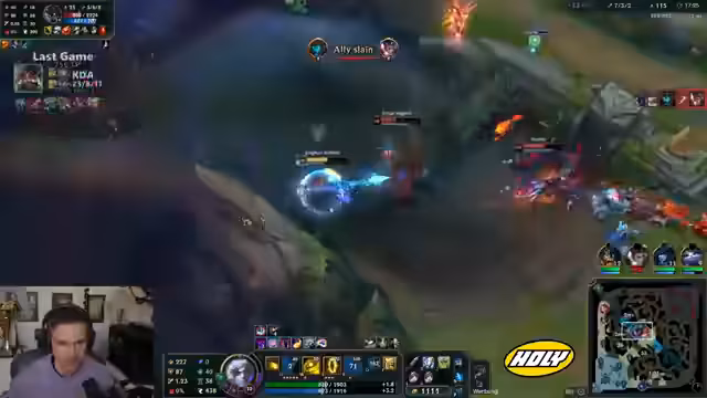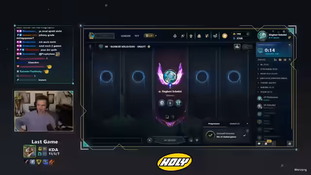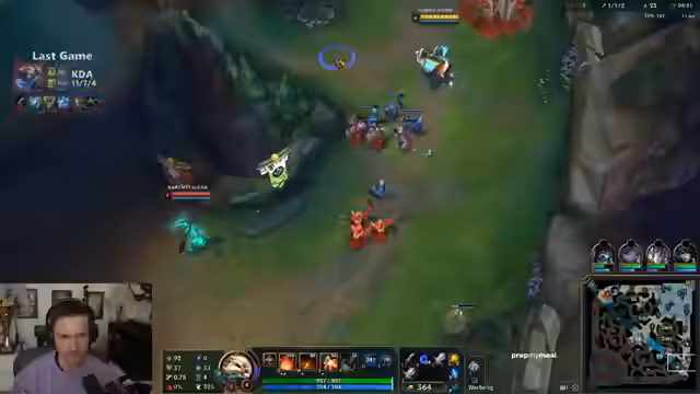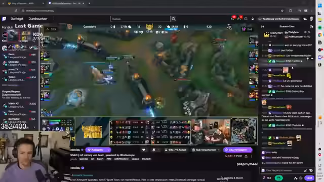 01:38:23Der Streamer analysiert sein League of Legends-Spiel, besonders die Anonymitätsfunktion und Champion-Selections. Er kritisiert die aktuelle Meta mit Champions wie Kalista, Renata und Poppy, die für Probleme sorgen. Streamer diskutiert Spielstrategien, Fehler in Teamfights und die Performance verschiedlicher Champions wie Corki und Ezreal. Er äußert sich auch über Chat-Verhalten und mögliche Toxizität im Spiel.