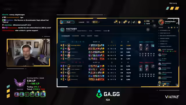 03:17:25Das Spiel endet trotz schwieriger Situation mit einem Sieg. Der Streamer ist erleichtert, da er es für einen Arbeiter-Sieg hält. Sie planen noch zwei weitere Spiele, um 500 EP zu erreichen. Der Streamer erwähnt, dass sie nahe an der Grandmaster-Grenze sind (750 LP) und aktuell eine Winrate von 60-65% haben. Er fragt sich, warum seine Mitspieler so oft in der Mitte sterben, obwohl alle Spells bereitstehen.