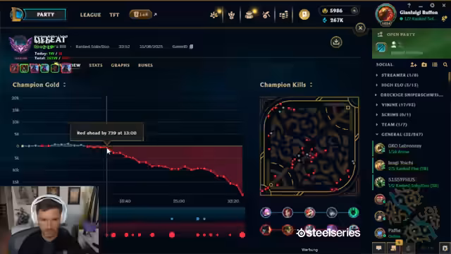Ein League of Legends-Spiel kippt durch unkoordinierte Kämpfe endgültig. Ein massiver Goldvorteil und ein starker Teamcomp der Gegner führen zur unaufhaltsamen Niederlage. Nach der Partie werden die systematischen Fehler des eigenen Teams als Ursache analysiert.