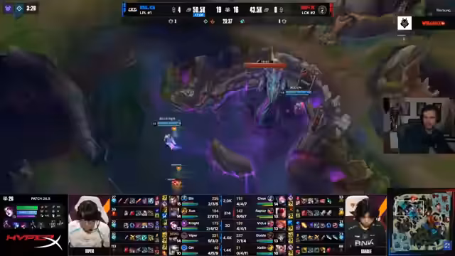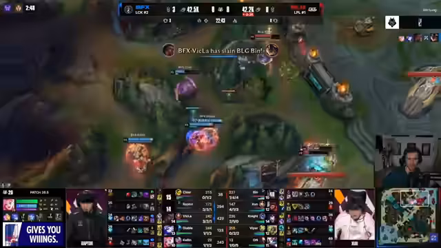00:43:19Das erste Spiel verläuft für BLG dominant. Knight auf Ryze dominiert die Mid-Lane gegen Wickler, während Bin auf Jax die Top-Lane gewinnt. BLG erarbeitet sich einen frühen, erheblichen Goldvorsprung. Trotzdem lässt BFX den ersten Drake entgegen des einen Goldvorsprungs fallen, was als taktischer Fehler gewertet wird. BLG nutzt den Vorteil und kontrolliert das Spiel, bis sie den Nexus stürmen und das erste Game klar mit 0:2 für sich entscheiden.