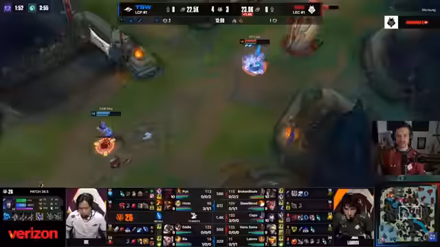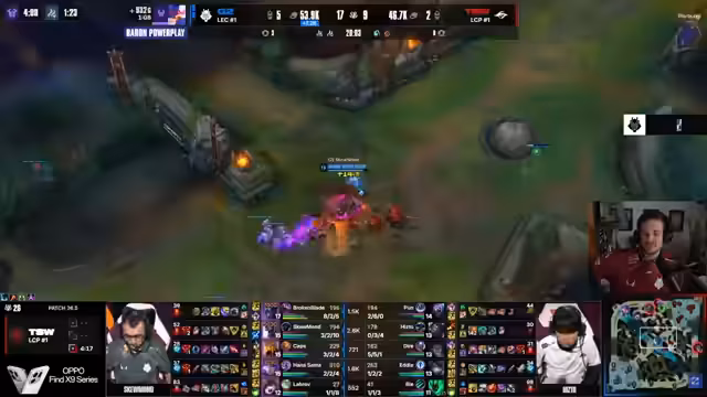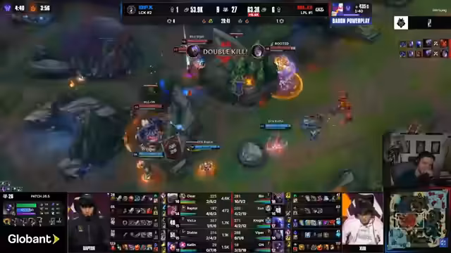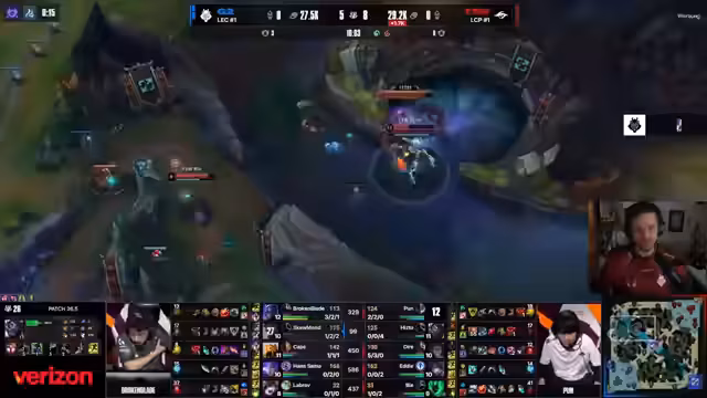 05:47:15Das Early Game auf der Toplane gestaltet sich extrem knapp und riskant, da beide Spieler, Kled und Olaf, vorhersagen, dass einer von ihnen sterben wird. Nach einem turbulenten Level-1-Fight verliert Kled den Kill nur knapp und das Gespräch dreht sich um die Logik von LoL, dass G2 mehr Gold erhält, obwohl Skirmon den Kill gemacht hat. Analysten beobachten, dass das Early Game von G2 dominiert wird, während Team Secret Raids Probleme mit der Koordination und der Schadensverteilung hat.