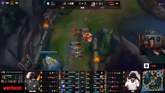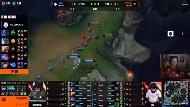 05:01:01Der Beginn des Spiels ist geprägt von einem konservativen Draft beider Teams und einem defensiven Early-Game. G2 kann jedoch durch frühe Kills und den Drachen-Vorteil einen Lead aufbauen. Der Kommentator hebt hervor, dass G2s Mid-Laner Caps mit seiner Ezreal-Figur herausragt und eine starke Dominanz zeigt. Trotz eines Rückstandes bei Team Secret Wales zeigt deren Aurora-Figur später beeindruckenden Schaden, was G2 jedoch durch kluge Entscheidungen und deren Fehlern überwinden kann.