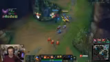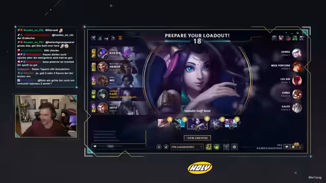 00:20:34Das erste League of Legends-Spiel startet mit einer ungewöhnlichen Team-Kombination. Der Streamer spielt Nami Support und muss einen MF-Support gegen Jenna Toplane behaupten. Das Botlane-Duell gestaltet sich schwierig, der gegnerische Draven wird als sehr nervös beschrieben. Trotz anfänglicher Probleme gewinnt das Duo die Lane und den Draven-Kill durch geschicktes Wellenmanagement. Das Spiel bleibt ungewiss, da das Team ohne einen starken Midlaner wenig Kontrolle über die Map hat und der Gegner einen engagierten Midlaner aufweist.