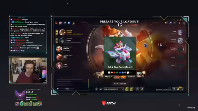 03:16:12Nach einem weiteren Sieg und einer fünffachen Gewinnstreak feiert der Streamer den Erfolg. Er führt diesen vielleicht auf Glück zurück, da er die aktuellen Odds für seinen Corki nicht gecheckt hat. Aus Freude über die Serie beschließt er, weiterhin Corki zu spielen, um den positiven Lauf nicht zu unterbrechen. Gleichzeitig diskutiert er alternative Skins für seinen Champion und wie Abwechslung im Champion-Pool für spielerische Veränderungen sorgen kann, auch wenn er sich für den Corki entscheidet.