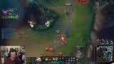 00:36:30Das Spiel verläuft für das Team nachhaltig schlecht. Der Midlaner stirbt mehrfach und ist laut Streamer im Spiel für den gegnerischen Teamerfolg verantwortlich. Die Map-Kontrolle geht verloren und die Aufstiegschancen scheinen gering. Trotzdem verspürt der Streamer plötzlich wieder Spaß, da seine Nami performance gut ist. Durch einen cleveren Drake-Tausch und anschließendem Teamfight gelingt dem Team ein unerwartetes Comeback und das Sieg.