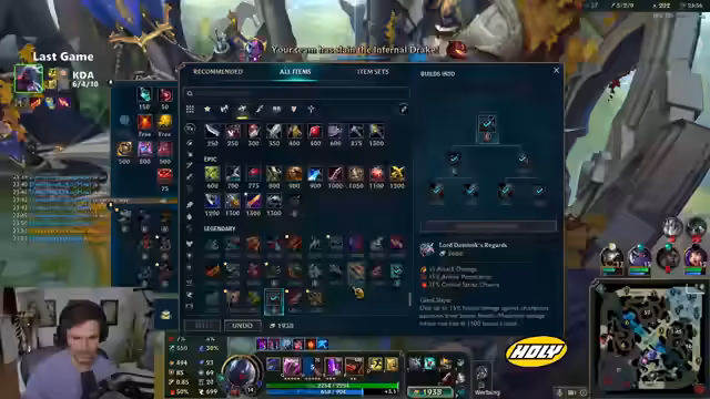 01:43:14Der Streamer experimentiert mit verschiedenen Item-Builds für Jhin im Late Game. Er vergleicht den Damage von Stormrazor, Hexplate und Bloodthirster, wobei Blutlanze aufgrund des Schilds und des hohen Damage als überlegen gilt. Er beschreibt den ultimativen Cooldown und die Values der Items und kommt zu dem Schluss, dass Standard-Builds wie Blutlanze und Collector nach wie vor am besten performen, während Experimente wie Hexplate nicht rentabel sind.