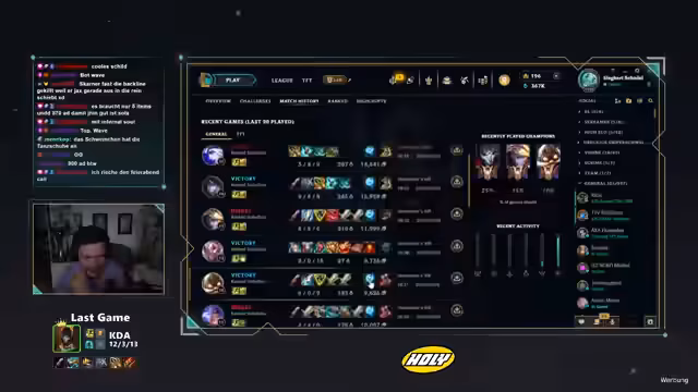 04:01:54Im weiteren Verlauf des Streams äußert der Streamer starkes Unverständnis und Frustration über das Spielverhalten seiner Mitspieler und selbst über das von Riot Games wahrgenommene Matchmaking. Er fühlt sich in einem seiner Spiele permanent von Riot „gegrieved“, also im Unrecht gelassen, und gibt an, dass das Ranked-System für 99% der Spieler irrelevant sei. Die ständigen Niederlagen führen dazu, dass er das Gefühl hat, handlungsunfähig zu sein und keine Kontrolle über das Aus des Spiels zu haben, da seine Teammates fundamentale Entscheidungen im Kampf vermissen lassen und nicht koordiniert agieren.